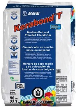 Kerabond T is a premium-grade, nonsag, nonslump mortar for use in thin-set and medium-bed applications in interior/exterior residential and commercial floors and walls when mixed with water.
